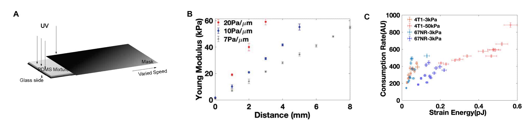 A) Schematic of the fabrication set up. To create a stiffness gradient, coverslips covered with photo-sensitive PDMS with a thickness of 200µm were irradiated with UV under variable exposure time by moving the UV mask with a constant speed. B) Local Young’s Modulus (LYM) as a function of the position and speed of mask movement. Increasing mask’s speed from 0.5µm/min to 2µm/min varied gradient steepness from 7kPa/mm to 20kPa/mm. C) Glucose consumption rate /fluorescence decay of glucose as a function of cell contractile work for 67NR (non-metastatic) and 4T1 (metastatic) cells on 3kPa and 50kPa substrates. Each data point is a single cell at least from three separate experiments. and error bars are analysis and experimental errors.
